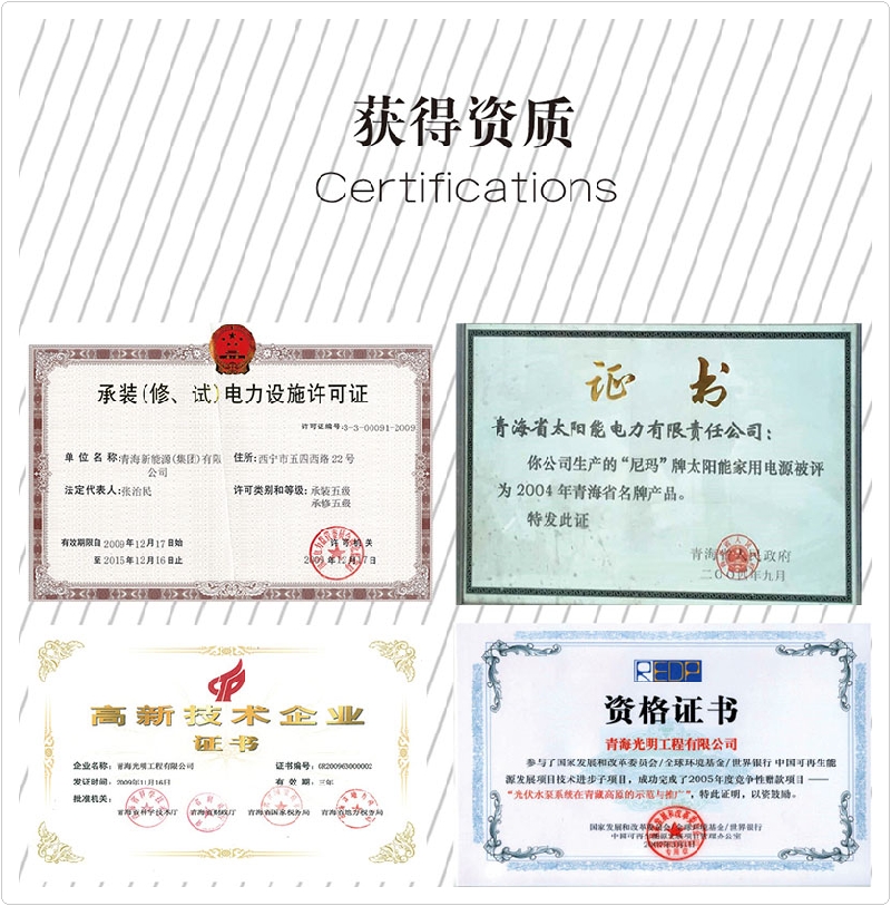 The company has won the "National Patent Advanced Science and Technology Institute", "National Youth Unity and Progress Collective", "Youth Civilization", "Qinghai Province Model Collective", "National Education, Culture and Health system advanced trade union organization", the province's "learning organization model" unit, the national "innovative pilot enterprise", three consecutive years by the Agricultural Bank of China Qinghai Branch awarded "AAA credit enterprise" and "AAA excellent customer" and other honorary titles. The company has "Nima" brand solar energy.